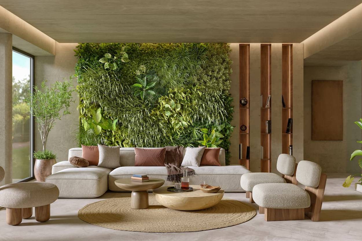 Combinan plantas vivas y artificiales, logrando un equilibrio entre estética y funcionalidad. Son ideales cuando se busca la frescura de las plantas naturales en zonas que requieren complementar espacios con opciones artificiales por practicidad.