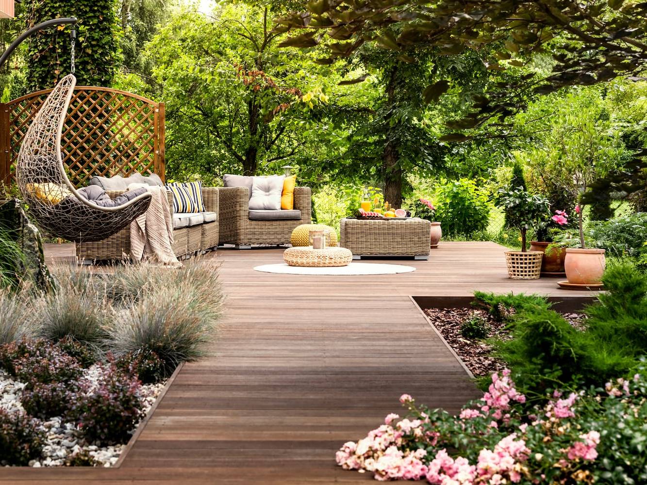 Un jardín con terraza de madera que invita al descanso y la relajación.
