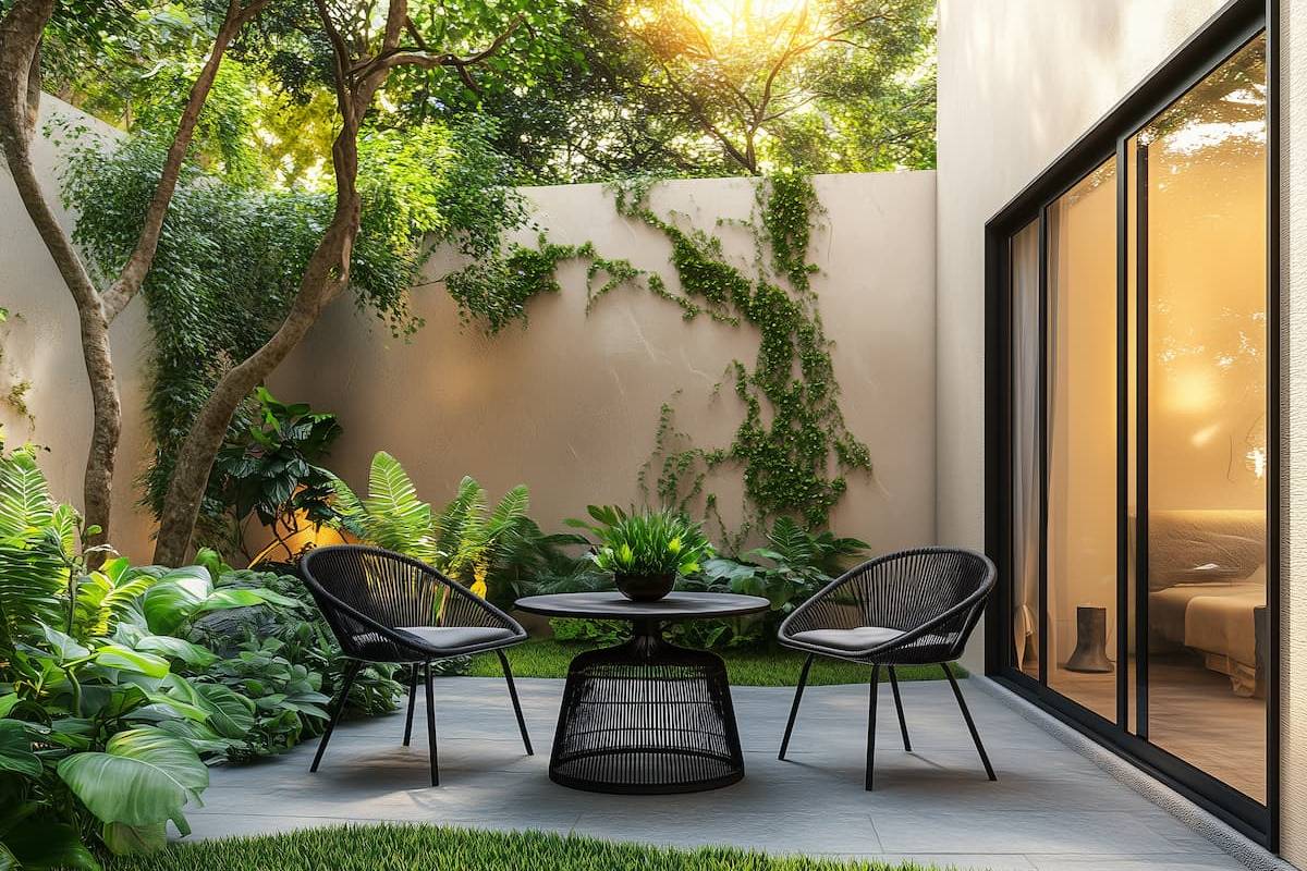 Un diseño de jardín moderno y acogedor que combina vegetación abundante con mobiliario minimalista.