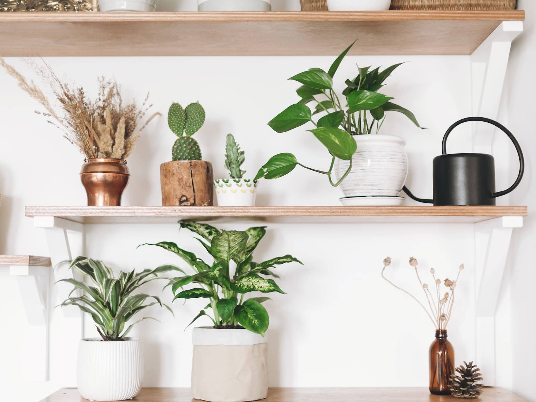 La belleza está en los detalles: pequeñas plantas de interior que transforman cada estantería en un refugio natural.
