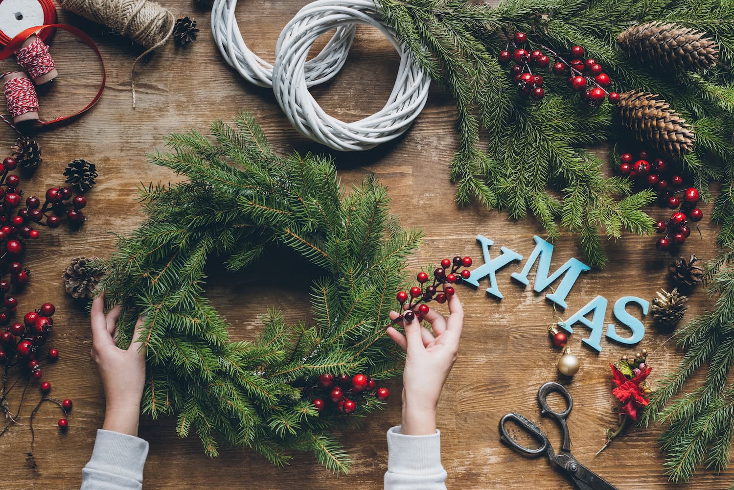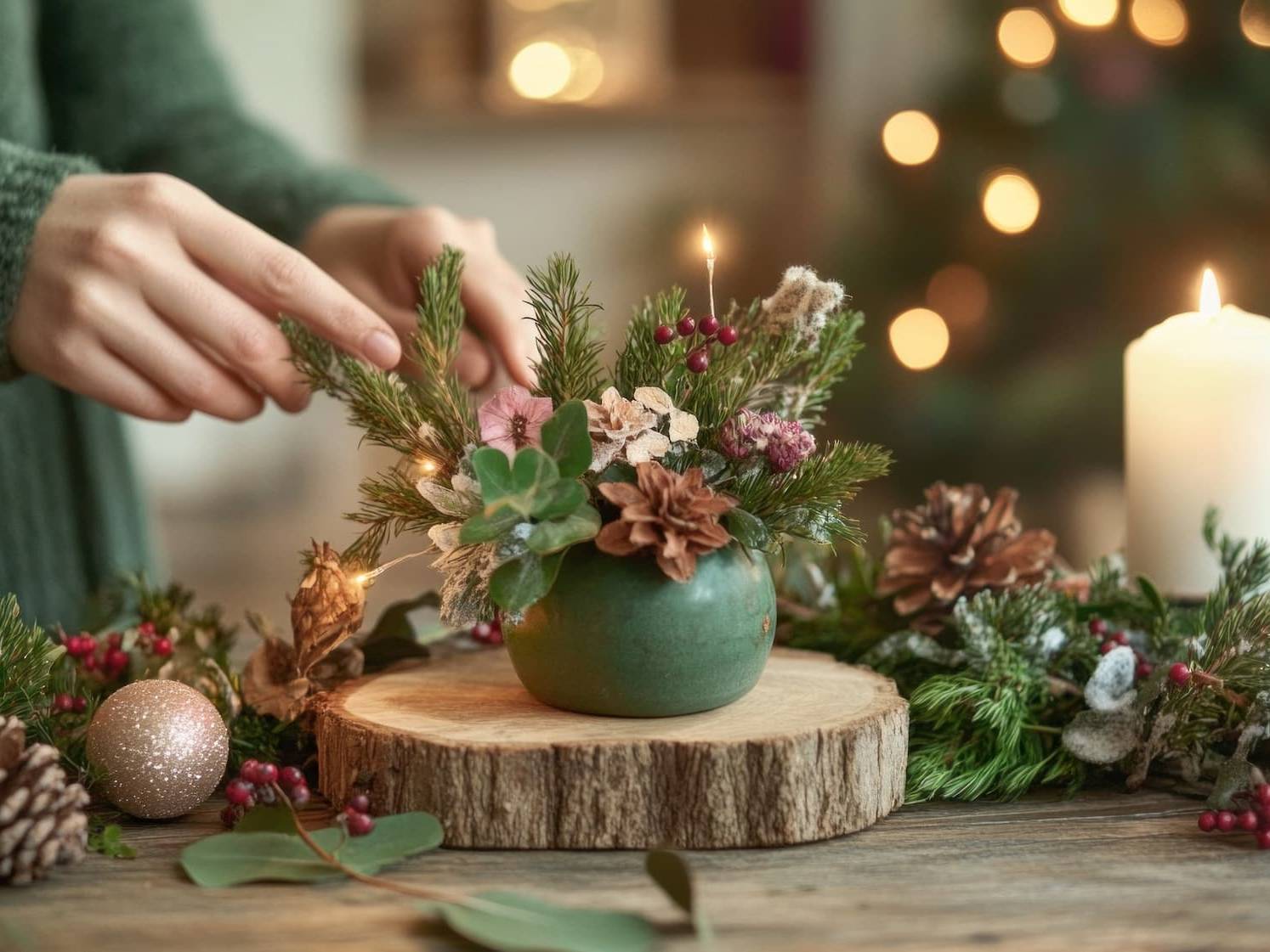 Si buscas un proyecto más elaborado, aprende cómo hacer un centro de mesa de Navidad colocando materiales como ramas de pino, velas y lazos sobre una base.