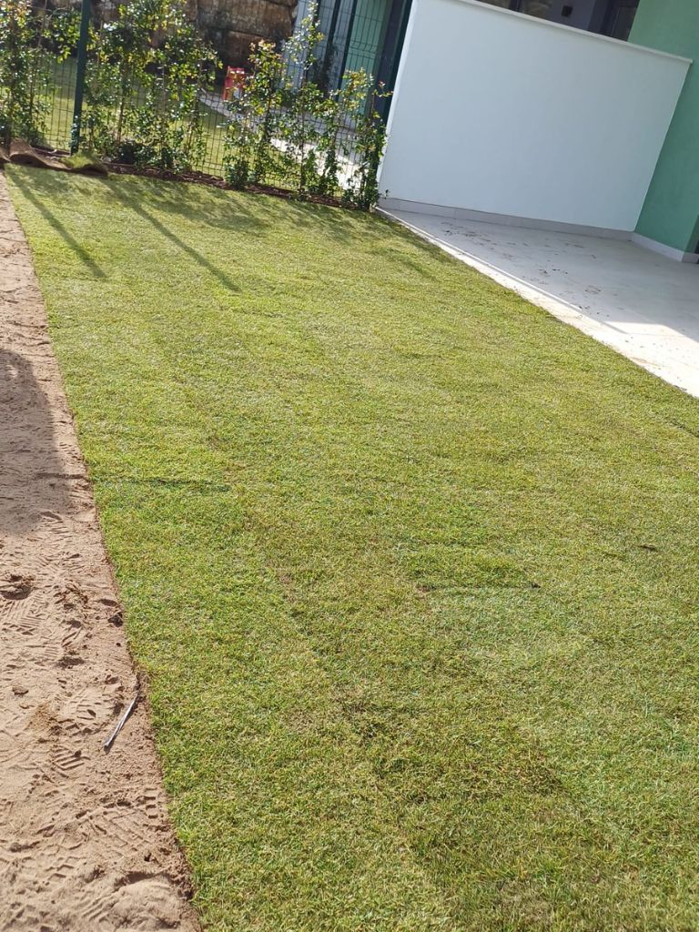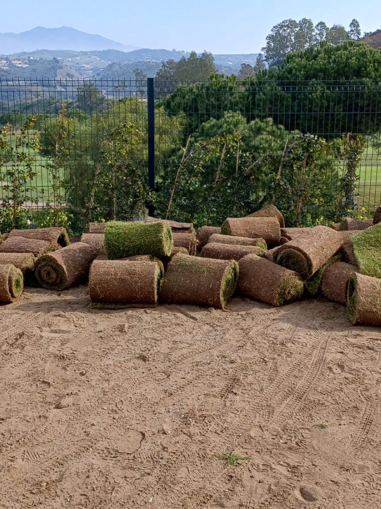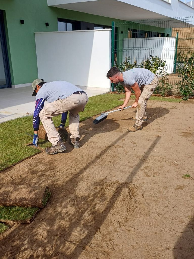 En Kronos Bahía, el equipo de Agrojardín está llevando a cabo actualmente la colocación de pradera de césped natural, de un año de cultivo, en los jardines de las viviendas de planta baja, dentro de los trabajos finales de jardinería de la urbanización.