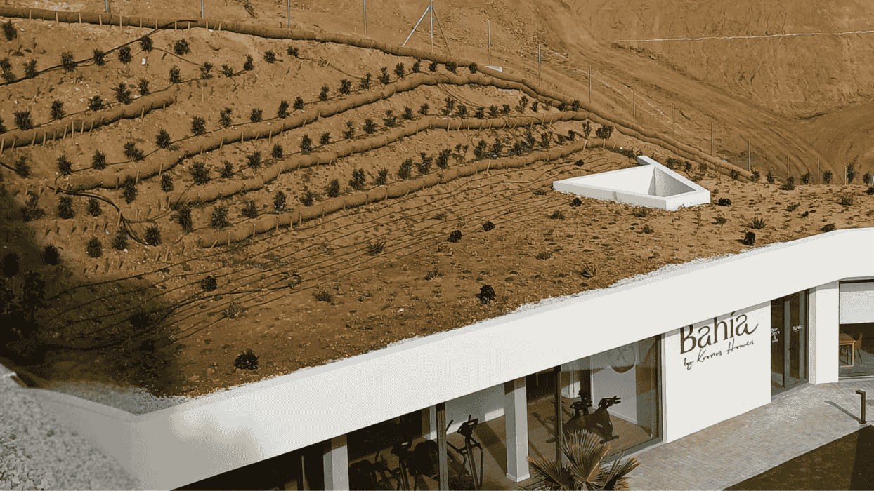 Uno de los elementos más singulares del proyecto se encuentra en la zona del club social, donde se ubican la sala de networking y el gimnasio. Sobre este espacio se ha ejecutado una cubierta ajardinada con una colección de crasas, especies adaptadas al clima de la zona.