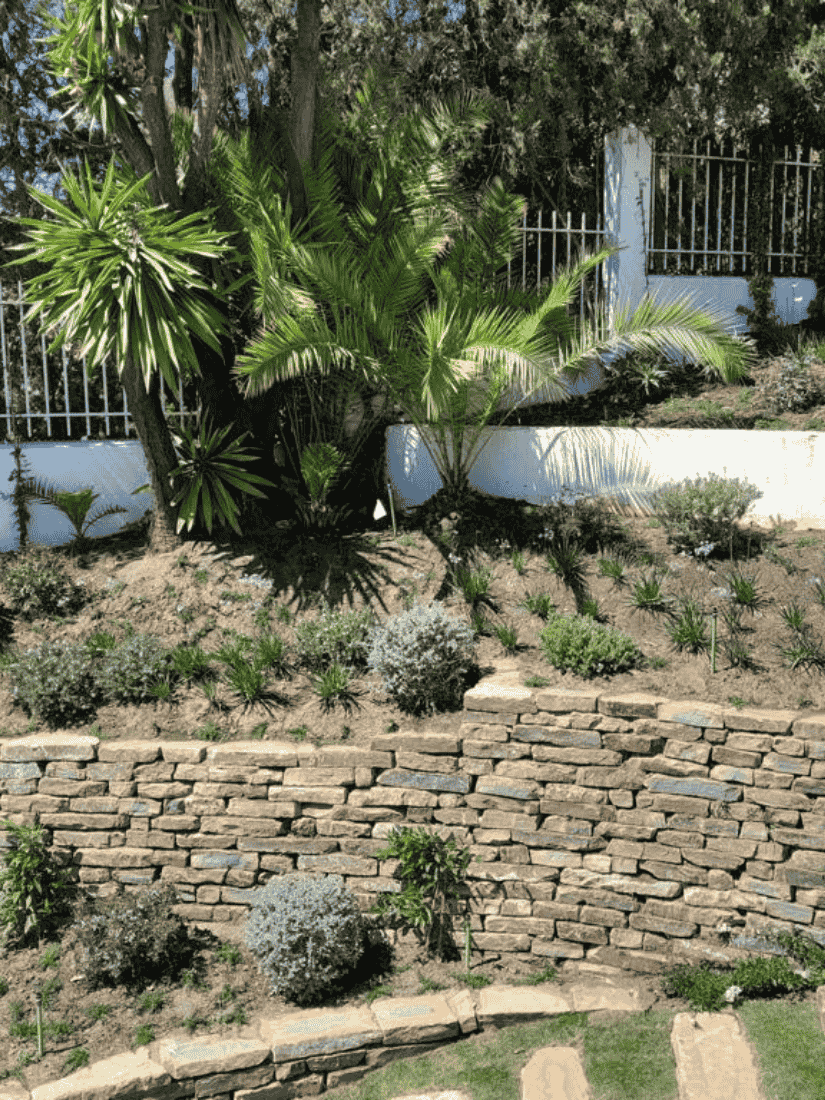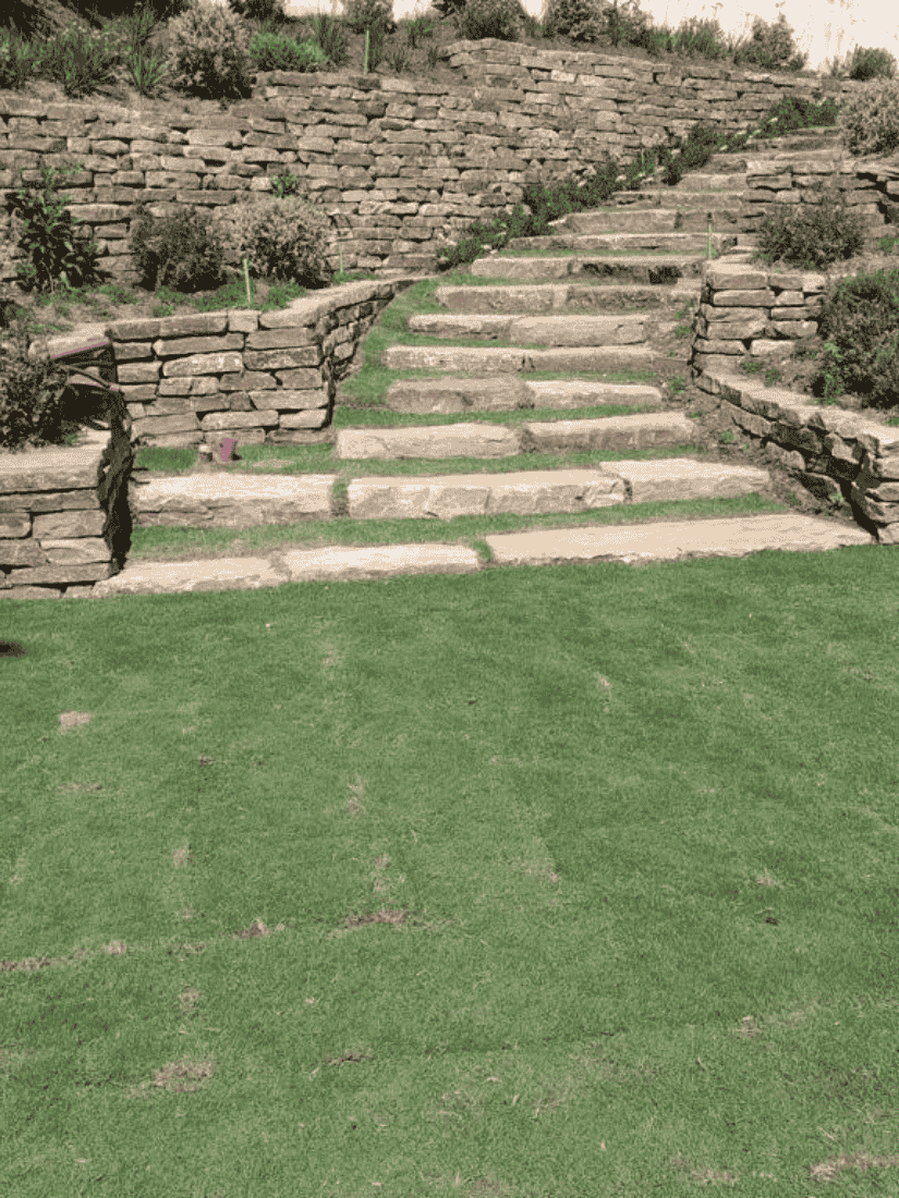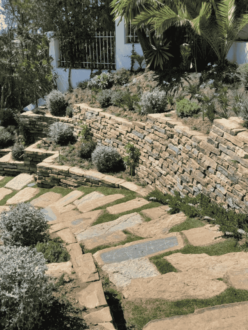 De este modo, en una primera fase, las actuaciones contempladas en el diseño de paisajismo que hemos ejecutado han sido unos muros y unas escaleras de piedra.