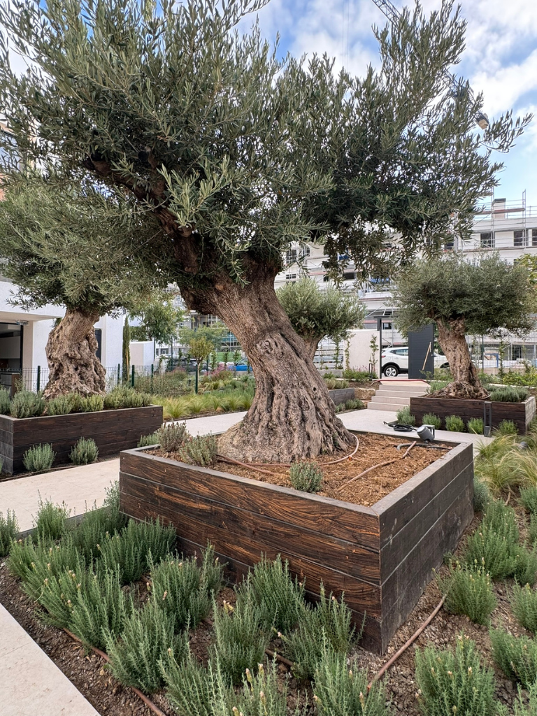 Durante la ejecución, Agrojardín llevó a cabo la plantación de ejemplares de gran porte, empleando maquinaria de gran tonelaje y un cuidadoso control técnico para garantizar su correcta integración. El proyecto incluye también jardineras de ecotraviesas antitorsión, muros de gaviones y un sistema de riego automatizado que optimiza cada recurso hídrico.