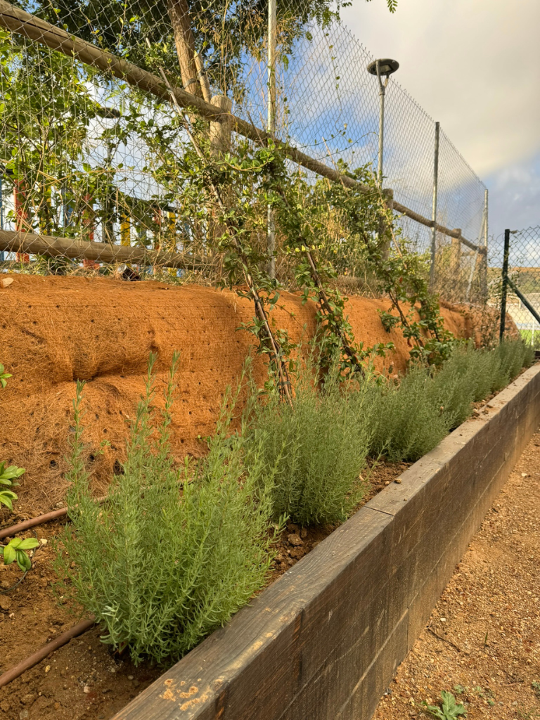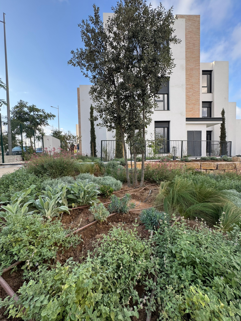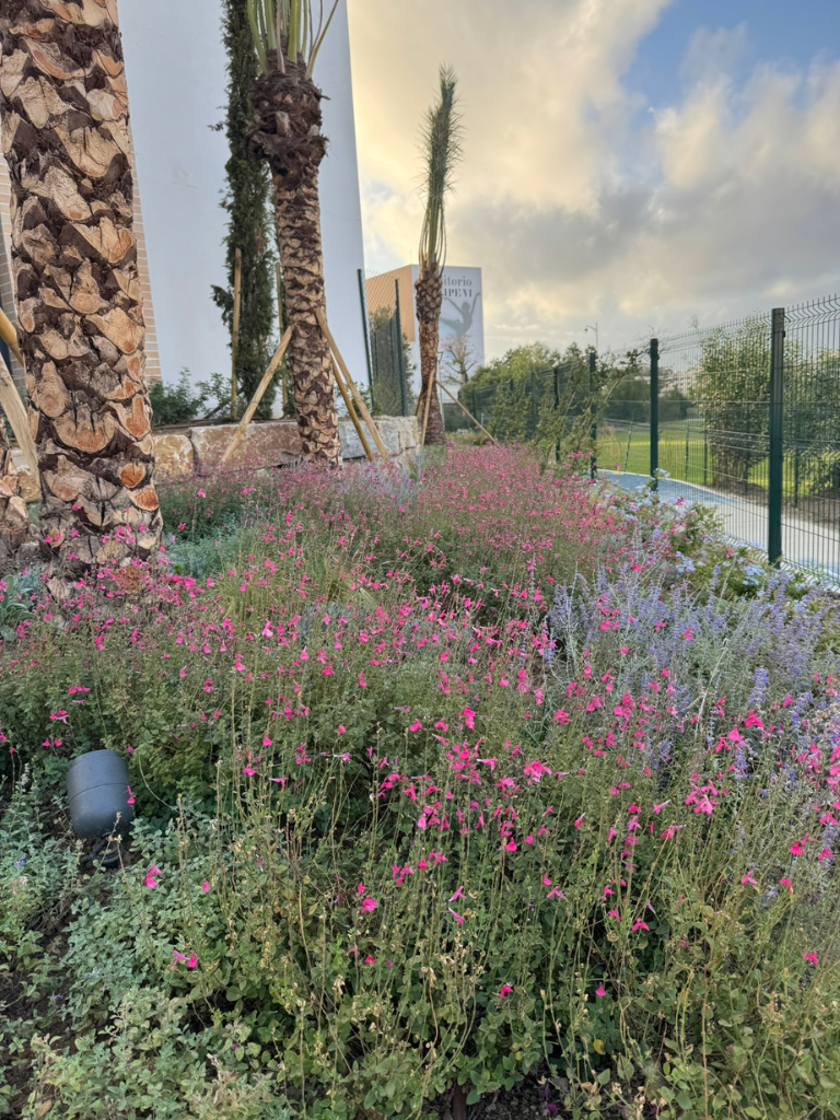 El diseño parte de una paleta vegetal mediterránea, con especies autóctonas y adaptadas al clima, lo que permite reducir el consumo de agua y los costes de mantenimiento. “Es un xerojardín, con plantas mediterráneas que requieren poco riego y mantenimiento. Al pasear por él, parece que estás en el campo, rodeado de vegetación muy agradable”, añade Castro.