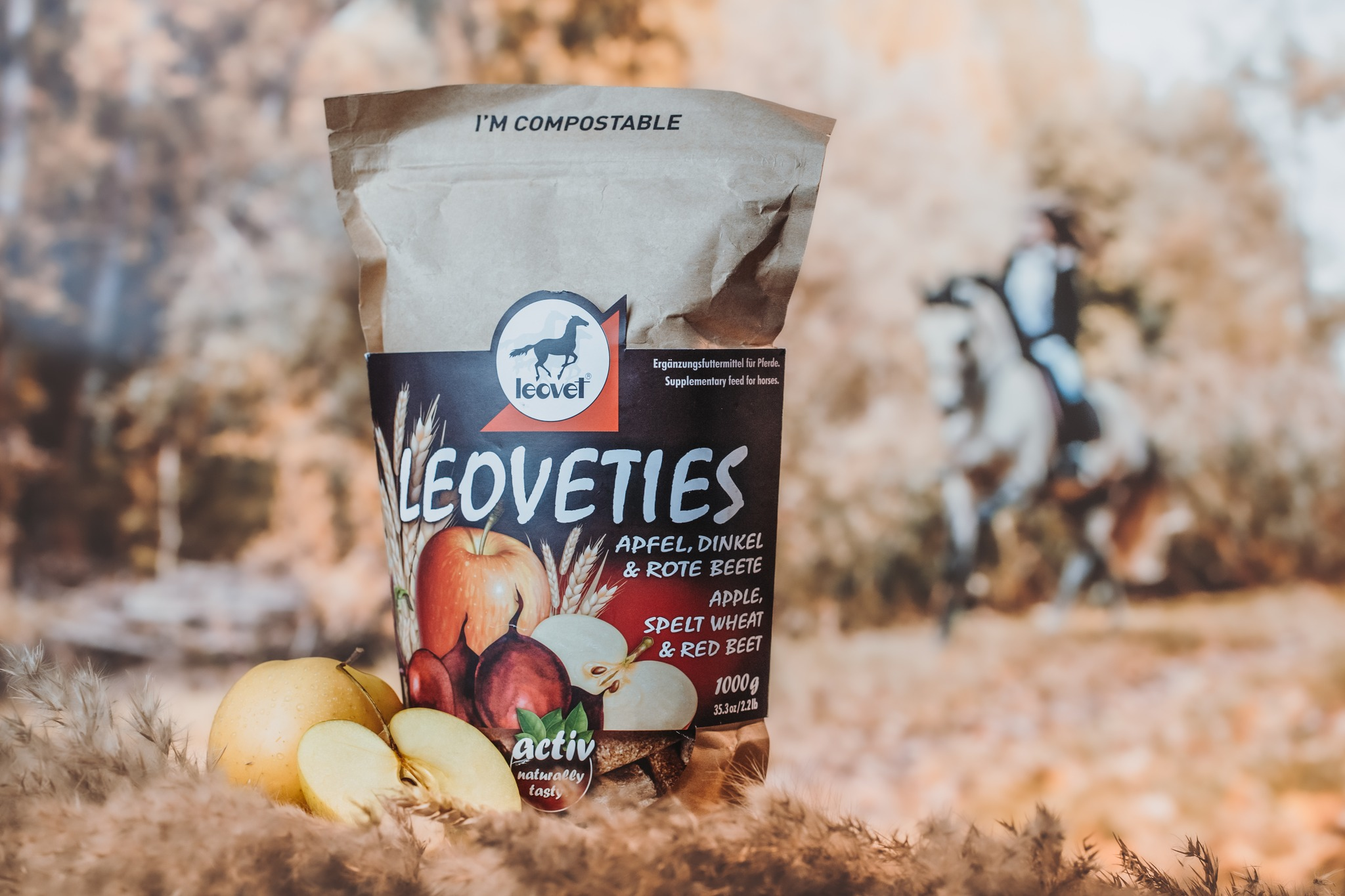 El contenido de la bolsa, los leoveties son deliciosos y los disfrutará su caballo. Porque no solo son deliciosos, sino también saludables y aportan variedad al menú. Los leoveties de Leovet son el alimento ideal de recompensa para su caballo y contienen cereales deliciosos para los caballos. Los leoveties ahora están disponibles en tres nuevos sabores. Plátano, cúrcuma y linaza, luego manzana, espelta y remolacha roja, así como zanahoria, mango y escaramujo.