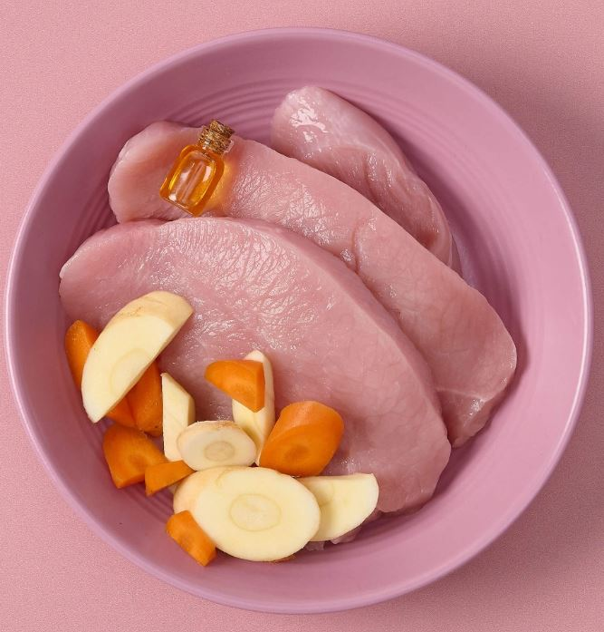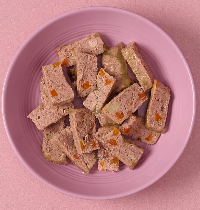 Comida deliciosamente equilibrada, perfecta como alimento único o como topping para combinar con pienso. Lata 100 gramos. Composición: pavo(65%), arándanos frescos(4%), chirivías(2%), zanahorias(2%), minerales(sulfato de glucosamina 100mg/kg), aceite de salmón, prebiótico(insulina 0.4%)
