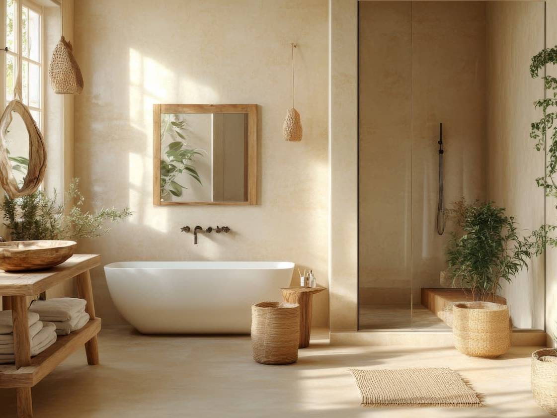 Un baño que combina líneas limpias, texturas suaves y el frescor de la naturaleza.